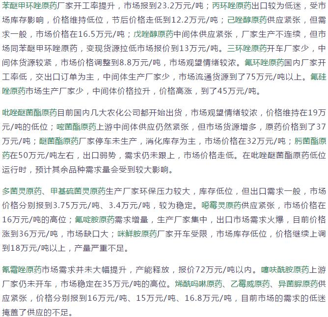 多款原藥貨源緊張價格提升