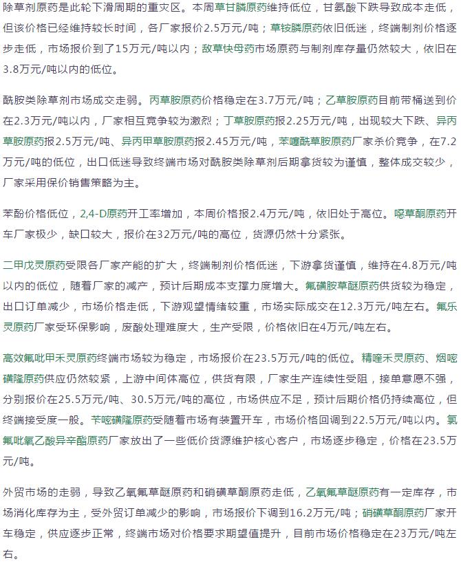 19年2月下旬國內農藥原藥除草劑價格走勢