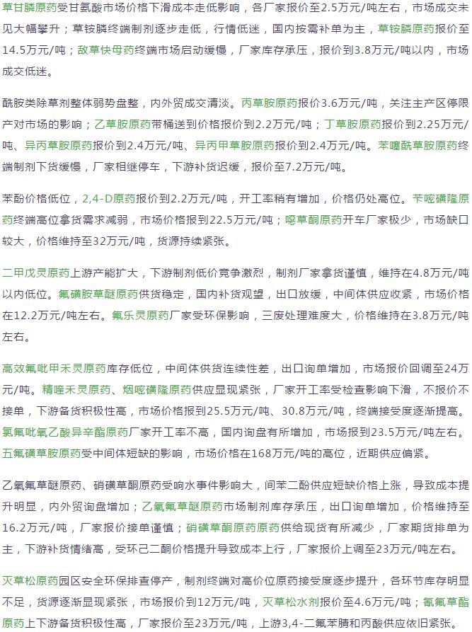 19年3月中旬國內農藥原藥除草劑價格走勢