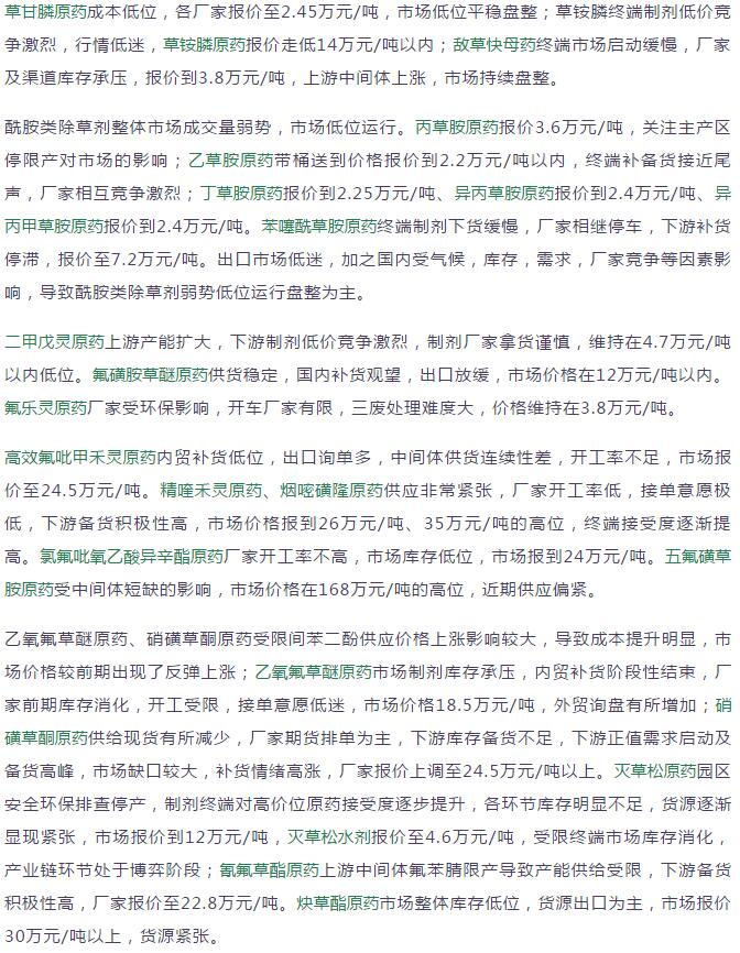 19年3月中旬國內農藥原藥除草劑價格走勢