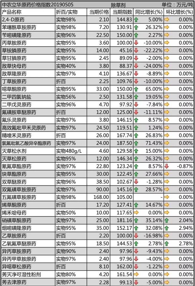 2019年5月初國內農藥原藥除草劑價格走勢
