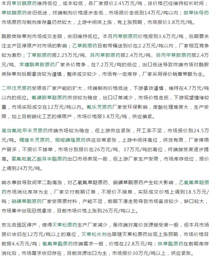 19年3月下旬國內農藥原藥除草劑價格走勢