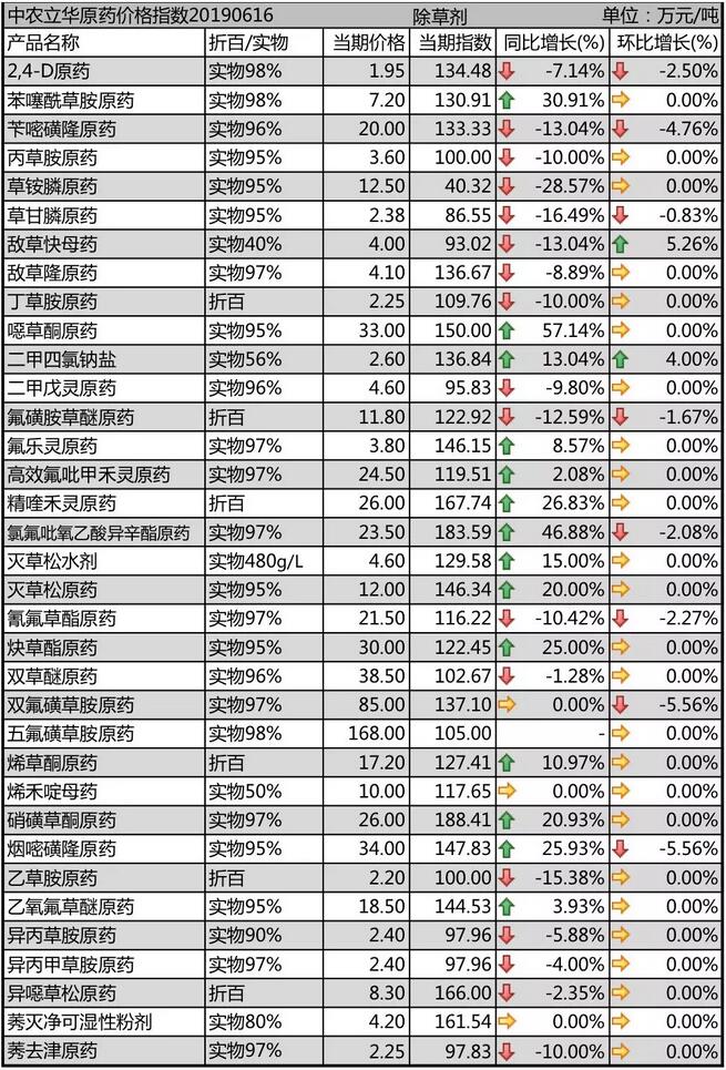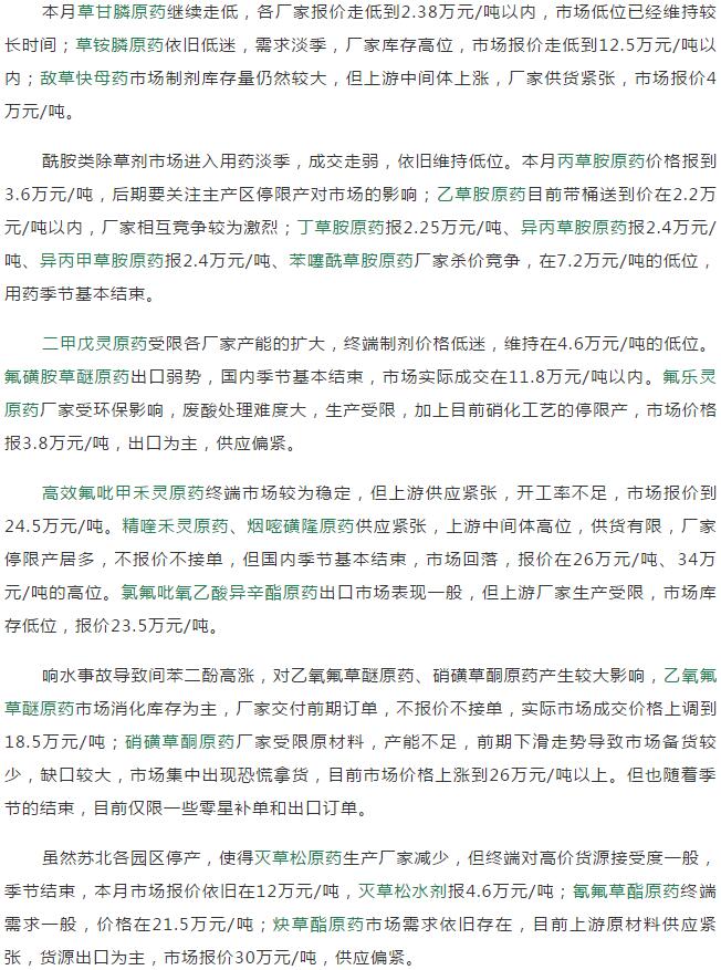 19年6月中旬國內農藥原藥除草劑價格走勢