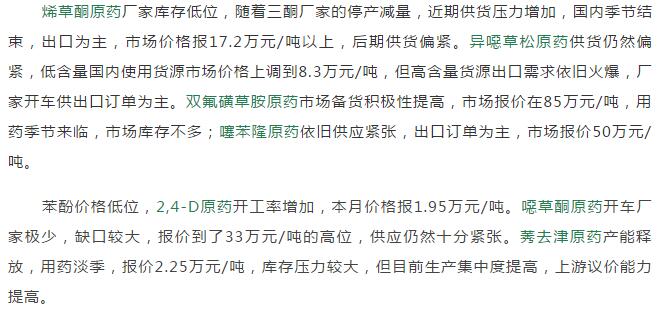 2019年5月中旬國內農藥原藥除草劑價格走勢