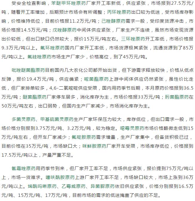 多款原藥貨源緊張價格提升