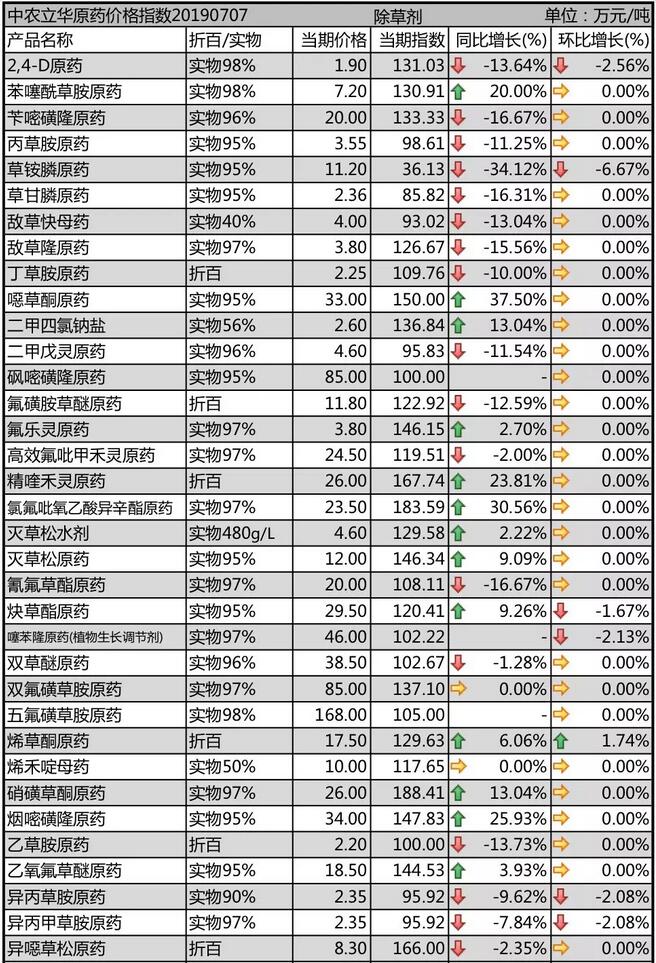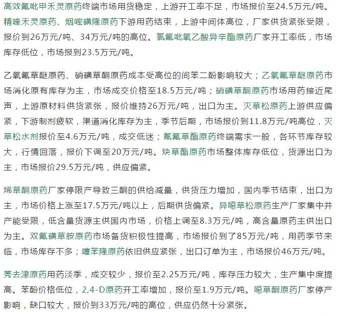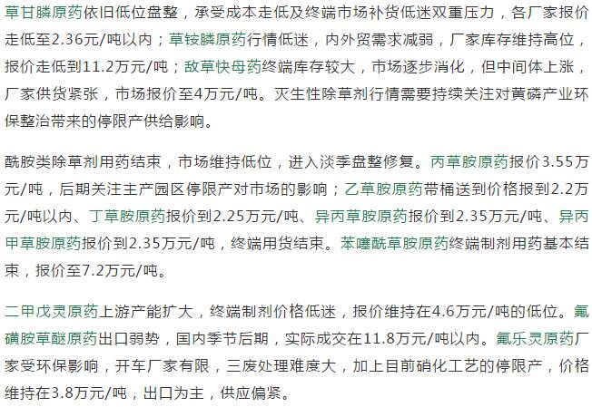 19年6月下旬國內農藥原藥除草劑價格走勢