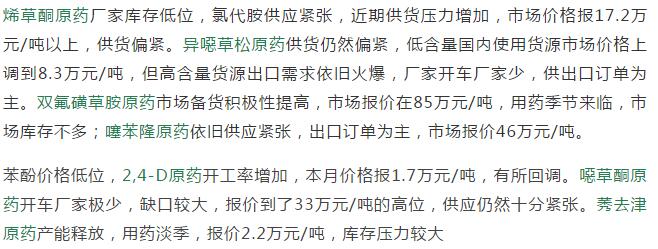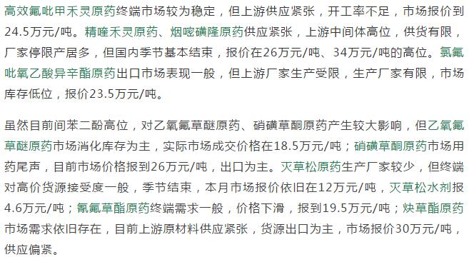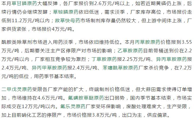 19年6月下旬國內農藥原藥除草劑價格走勢