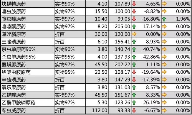 有機磷(lin)類(lei)產(chan)品受限(xian)下(xia)游需求(qiu)弱勢影響,行情上漲后出現緩慢回調。馬拉硫磷(lin)原(yuan)(yuan)藥(yao)生產(chan)廠(chang)家(jia)少,價(jia)格(ge)維持(chi)在2.85萬(wan)元(yuan)/噸(dun)的高位(wei);丙(bing)溴磷(lin)原(yuan)(yuan)藥(yao)、毒死蜱(pi)原(yuan)(yuan)藥(yao)、辛硫磷(lin)原(yuan)(yuan)藥(yao)受限(xian)磷(lin)化(hua)工整治影響,價(jia)格(ge)堅挺;丙(bing)溴磷(lin)原(yuan)(yuan)藥(yao)價(jia)格(ge)維持(chi)7萬(wan)元(yuan)/噸(dun)高位(wei),毒死蜱(pi)原(yuan)(yuan)藥(yao)行情有所(suo)回調,報(bao)價(jia)4.8萬(wan)元(yuan)/噸(dun),辛硫磷(lin)原(yuan)(yuan)藥(yao)用藥(yao)淡(dan)季(ji)報(bao)價(jia)至3.8萬(wan)元(yuan)/噸(dun)。