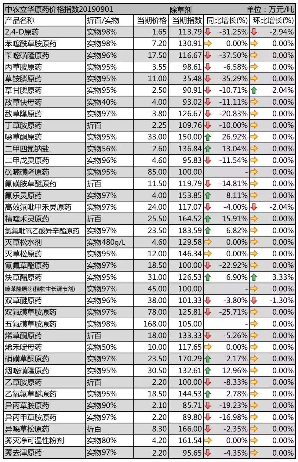 部分選擇性除草劑品種雖然供應緊張,但市場淡季,終端需求較弱;整體除草劑品種極為平淡,2019年09月01日發布的中農立華除草劑原藥價格指數報(bao)99.11點(dian),同比去年大幅(fu)下跌8.38%。