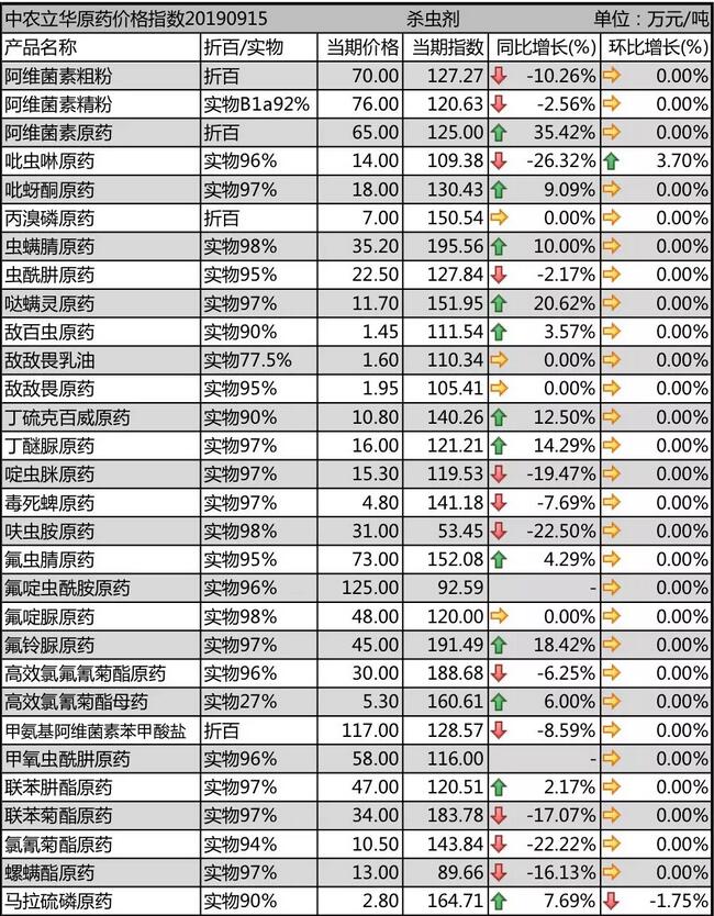 殺蟲劑大產品依舊低位,導致指數低位,2019年09月15日中農立華殺蟲劑原藥價格指數報125.23點,環比上月微漲,同比去年大幅(fu)下跌(die)15.25%,主要受到(dao)菊酯類(lei)、煙(yan)堿(jian)類(lei)產(chan)品大幅(fu)下跌(die)的(de)影響。