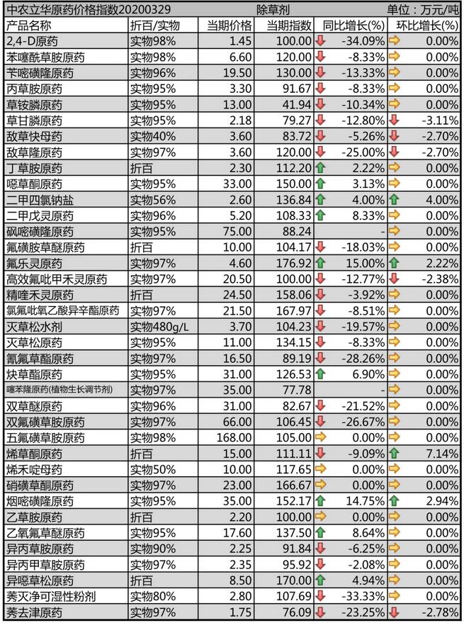 2,4-D原(yuan)(yuan)藥庫存減(jian)少(shao),廠家(jia)排單增多,本月價格報1.45萬(wan)元(yuan)/噸(dun)。噁草酮(tong)原(yuan)(yuan)藥開(kai)車廠家(jia)極少(shao),出口訂單缺(que)口較大,報價在33萬(wan)元(yuan)/噸(dun)的高位(wei),供應仍然(ran)十(shi)分緊張(zhang)。莠去津原(yuan)(yuan)藥備貨展(zhan)開(kai),廠家(jia)庫存較大,報價下調至1.75萬(wan)元(yuan)/噸(dun)。