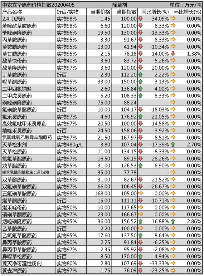 2,4-D原藥(yao)庫存減少,廠(chang)家排單(dan)增多,價格報(bao)(bao)(bao)1.45萬元/噸;噁草酮原藥(yao)開車廠(chang)家極(ji)少,出口訂單(dan)缺口較(jiao)大(da),報(bao)(bao)(bao)價在33萬元/噸的高位,供應仍(reng)然十(shi)分緊張;莠去津原藥(yao)備貨展開,廠(chang)家庫存較(jiao)大(da),報(bao)(bao)(bao)價下(xia)調至1.75萬元/噸。