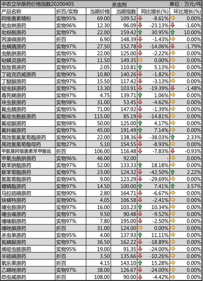 噠螨靈(ling)原(yuan)藥開工率(lv)回升,供應穩定,報價11.5萬(wan)元(yuan)/噸(dun);螺螨酯原(yuan)藥、炔螨特原(yuan)藥等(deng)用藥季(ji)節到來(lai),價格(ge)上漲,分別報到14.5萬(wan)元(yuan)/噸(dun)、4.05萬(wan)元(yuan)/噸(dun),庫存較低,供貨(huo)偏緊;茚(yin)蟲威(wei)原(yuan)藥需(xu)求增多,庫存減少,市場價格(ge)在(zai)108萬(wan)元(yuan)/噸(dun)。