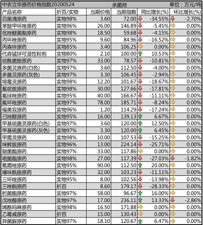 苯醚甲環唑原藥開工率低,庫存少,市場價格依舊在26萬元/噸的高位,供貨缺口較大;丙環唑原藥雖然供應偏緊,但(dan)價(jia)格維持低(di)(di)位(wei),前(qian)期市場政府招標消化部分(fen)庫(ku)存(cun),目前(qian)價(jia)格報(bao)9.6萬(wan)元(yuan)(yuan)/噸(dun);己(ji)唑(zuo)(zuo)醇原藥(yao)需求提(ti)升(sheng),開(kai)工(gong)(gong)率低(di)(di),市場價(jia)格報(bao)16萬(wan)元(yuan)(yuan)/噸(dun),短期供應緊張(zhang);戊(wu)唑(zuo)(zuo)醇原藥(yao)廠家(jia)(jia)開(kai)工(gong)(gong)率提(ti)升(sheng),雖(sui)然市場庫(ku)存(cun)低(di)(di)位(wei),但(dan)目前(qian)性(xing)價(jia)比(bi)較(jiao)低(di)(di),市場信心不足,報(bao)價(jia)回落到17萬(wan)元(yuan)(yuan)/噸(dun),開(kai)工(gong)(gong)率有所提(ti)升(sheng);三環唑(zuo)(zuo)原藥(yao)市場報(bao)到8萬(wan)元(yuan)(yuan)/噸(dun);氟環唑(zuo)(zuo)原藥(yao)市場貨源依舊偏緊,流通貨源在78萬(wan)元(yuan)(yuan)/噸(dun);氟硅(gui)唑(zuo)(zuo)原藥(yao)市場生產廠家(jia)(jia)少,報(bao)價(jia)40萬(wan)元(yuan)(yuan)/噸(dun)左(zuo)右。