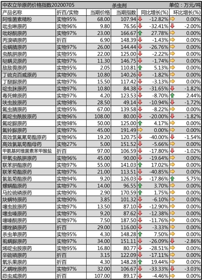 氟(fu)蟲腈(jing)原(yuan)(yuan)藥(yao)廠家出口為主,目前價格報67萬(wan)(wan)元(yuan)/噸(dun)(dun);隨(sui)著需求的提升(sheng),目前氟(fu)啶脲原(yuan)(yuan)藥(yao)供貨(huo)偏緊,報50萬(wan)(wan)元(yuan)/噸(dun)(dun);氟(fu)鈴脲原(yuan)(yuan)藥(yao)報45萬(wan)(wan)元(yuan)/噸(dun)(dun);虱螨(man)脲原(yuan)(yuan)藥(yao)庫存減少,但終(zhong)端制劑價格競爭激(ji)烈,市(shi)場價格沖(chong)高回落,報34萬(wan)(wan)元(yuan)/噸(dun)(dun);乙螨(man)唑原(yuan)(yuan)藥(yao)供應平穩,需求接近(jin)季節尾聲,渠(qu)道拋(pao)貨(huo)增多,報價32萬(wan)(wan)元(yuan)/噸(dun)(dun)。