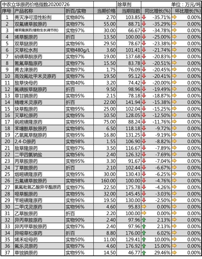 2,4-D原藥(yao)庫存減(jian)少,價格(ge)報到1.55萬元(yuan)/噸;噁草(cao)酮原藥(yao)貨源緊張,國內季節結束,報價在32萬元(yuan)/噸;莠去津原藥(yao)報價至1.75萬元(yuan)/噸。