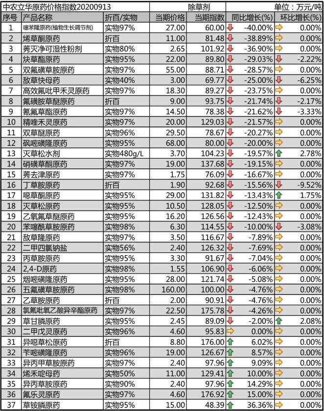 高效氟吡(bi)甲禾靈原(yuan)(yuan)藥終(zhong)端需求一般(ban),市(shi)場有(you)庫(ku)存(cun)(cun),出(chu)口(kou)為主,市(shi)場報(bao)價(jia)下行到18.3萬(wan)(wan)(wan)元/噸(dun)。精喹(kui)禾靈原(yuan)(yuan)藥開工率提(ti)升,下游(you)需求弱勢,市(shi)場報(bao)價(jia)到了20萬(wan)(wan)(wan)元/噸(dun),煙嘧磺隆原(yuan)(yuan)藥庫(ku)存(cun)(cun)偏低,傳統用藥淡季,市(shi)場成(cheng)交少,報(bao)價(jia)回落至28萬(wan)(wan)(wan)元/噸(dun)以內。氯氟吡(bi)氧乙酸異辛(xin)酯原(yuan)(yuan)藥庫(ku)存(cun)(cun)低位,供(gong)應仍(reng)然偏緊,出(chu)口(kou)為主,市(shi)場報(bao)22.5萬(wan)(wan)(wan)元/噸(dun)。