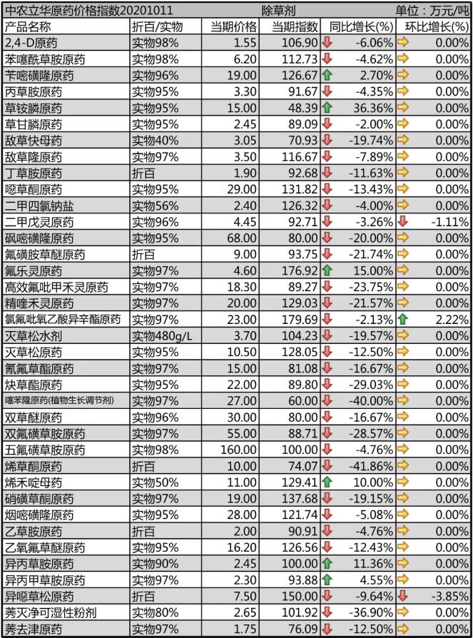 2,4-D原(yuan)藥開(kai)工(gong)率平穩(wen),價(jia)格穩(wen)定(ding)在1.55萬元/噸。噁(wu)草酮原(yuan)藥開(kai)工(gong)廠(chang)家增多,出口為主,報(bao)價(jia)回調(diao)到(dao)29萬元/噸。莠去津(jin)原(yuan)藥廠(chang)家庫存(cun)較(jiao)大,報(bao)價(jia)1.75萬元/噸。