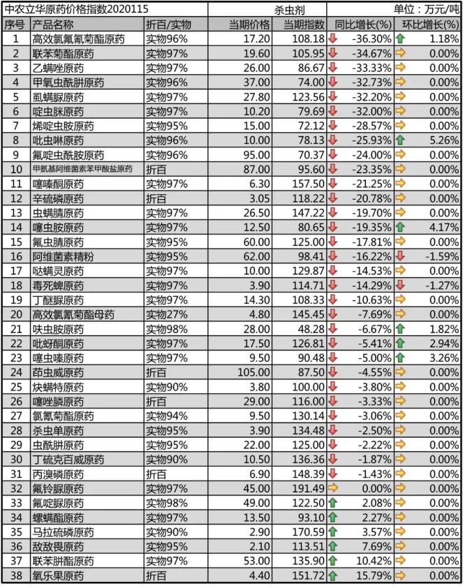 噠螨靈原藥(yao)(yao)供應穩(wen)(wen)定(ding),報(bao)價10萬(wan)元/噸(dun)(dun);螺螨酯原藥(yao)(yao)市(shi)場流(liu)通價格報(bao)13.5萬(wan)元/噸(dun)(dun),較為穩(wen)(wen)定(ding);炔螨特(te)原藥(yao)(yao)市(shi)場需求減弱,市(shi)場報(bao)價3.8萬(wan)元/噸(dun)(dun);茚蟲威(wei)原藥(yao)(yao)需求啟(qi)動(dong),市(shi)場價格穩(wen)(wen)定(ding)在105萬(wan)元/噸(dun)(dun)。