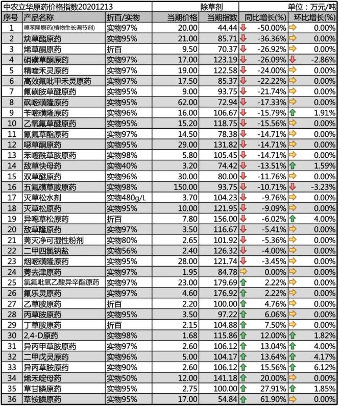 本月草甘膦原藥庫存低位,黃磷、甘氨酸大幅上漲,廠家接連上調報價,目前報價2.75萬元/噸,期單已經排到1月底,預計后期會維持高位;草銨膦原藥目前供應依舊緊張,無新增產能入市,用貨季節到來,報價到17萬元/噸;敵草快母藥受巴西百草枯禁用,出口訂單增加影響,廠家上調報價,二溴乙烷供應緊張,生產產能未能放開,市場報到3.2萬元/噸以上。
