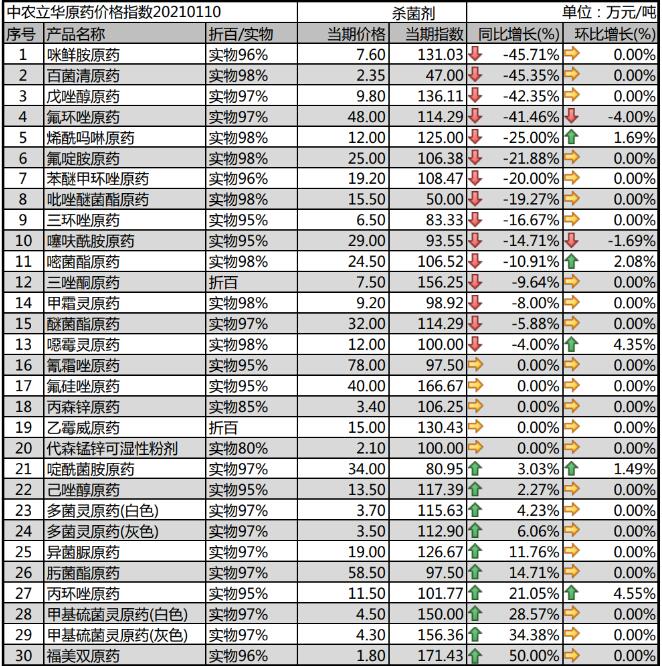多菌(jun)(jun)靈(ling)(ling)原藥(yao)開工(gong)率一般,報價(jia)3.8萬元(yuan)/噸、甲基硫菌(jun)(jun)靈(ling)(ling)原藥(yao)廠(chang)家排單較多,現貨十分緊張,上(shang)漲到(dao)4.5萬元(yuan)/噸;噁霉靈(ling)(ling)原藥(yao)廠(chang)家開工(gong)率不足,期貨排單為主(zhu),市(shi)(shi)場(chang)現貨很少,價(jia)格(ge)報到(dao)12萬元(yuan)/噸;氟啶胺(an)原藥(yao)目前價(jia)格(ge)到(dao)25萬元(yuan)/噸;咪鮮(xian)胺(an)原藥(yao)小(xiao)廠(chang)停車較多,市(shi)(shi)場(chang)上(shang)大(da)廠(chang)現貨不多,價(jia)格(ge)報到(dao)7.6萬元(yuan)/噸。