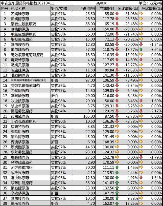噠螨靈原(yuan)藥(yao)供應穩定(ding),報價(jia)9.8萬(wan)元/噸(dun);螺(luo)螨酯原(yuan)藥(yao)廠家排長期單為主,價(jia)格(ge)到14.5萬(wan)元/噸(dun);炔(gui)螨特原(yuan)藥(yao)報價(jia)到了3.85萬(wan)元/噸(dun);茚蟲威原(yuan)藥(yao)市場價(jia)格(ge)在105萬(wan)元/噸(dun)。