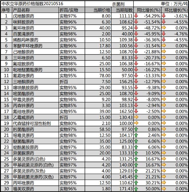 多(duo)菌(jun)靈(ling)原(yuan)(yuan)(yuan)藥(yao)(yao)(yao)生(sheng)產廠家環保壓力(li)較大,開(kai)工率一般(ban),庫存低位,市(shi)場(chang)(chang)報(bao)(bao)價(jia)維持在(zai)4.2萬元(yuan)(yuan)(yuan)(yuan)(yuan)/噸;甲基硫菌(jun)靈(ling)原(yuan)(yuan)(yuan)藥(yao)(yao)(yao)成本(ben)壓力(li)大,市(shi)場(chang)(chang)價(jia)格報(bao)(bao)到4.2萬元(yuan)(yuan)(yuan)(yuan)(yuan)/噸;噁霉靈(ling)原(yuan)(yuan)(yuan)藥(yao)(yao)(yao)市(shi)場(chang)(chang)價(jia)格報(bao)(bao)至(zhi)12.5萬元(yuan)(yuan)(yuan)(yuan)(yuan)/噸,供應(ying)偏(pian)緊,但需求未得到提升;氟啶胺(an)原(yuan)(yuan)(yuan)藥(yao)(yao)(yao)終端用藥(yao)(yao)(yao)量減(jian)少,市(shi)場(chang)(chang)觀望情緒較重(zhong),目前價(jia)格下滑至(zhi)25萬元(yuan)(yuan)(yuan)(yuan)(yuan)/噸;咪鮮胺(an)原(yuan)(yuan)(yuan)藥(yao)(yao)(yao)消化(hua)庫存為主(zhu),季節后(hou)期,市(shi)場(chang)(chang)價(jia)格報(bao)(bao)到6.3萬元(yuan)(yuan)(yuan)(yuan)(yuan)/噸。