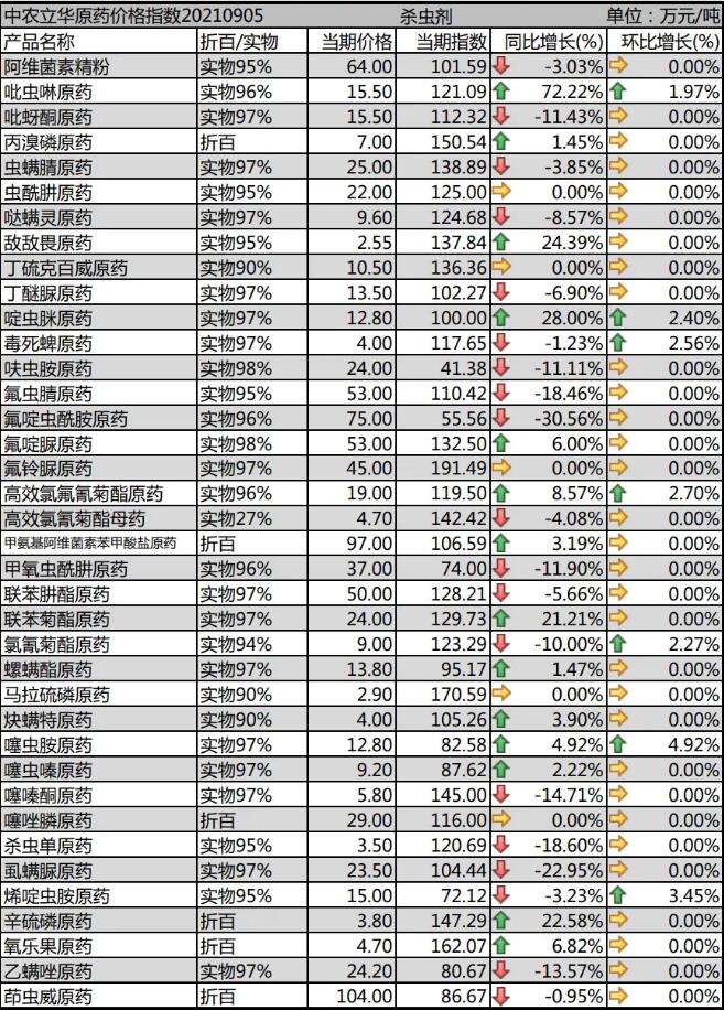 噠螨靈原藥供應穩定(ding),報(bao)價9.6萬(wan)(wan)元(yuan)(yuan)/噸;螺(luo)螨(man)酯原藥(yao)市(shi)(shi)場庫存低位,流通價格(ge)報(bao)13.8萬(wan)(wan)元(yuan)(yuan)/噸,較為穩定(ding);炔螨(man)特原藥(yao)市(shi)(shi)場需(xu)求一般,但庫存消化(hua),市(shi)(shi)場報(bao)價上漲到(dao)4萬(wan)(wan)元(yuan)(yuan)/噸;茚(yin)蟲(chong)威原藥(yao)需(xu)求啟動,開工率偏低,市(shi)(shi)場庫存低位,目前價格(ge)穩定(ding)在104萬(wan)(wan)元(yuan)(yuan)/噸。