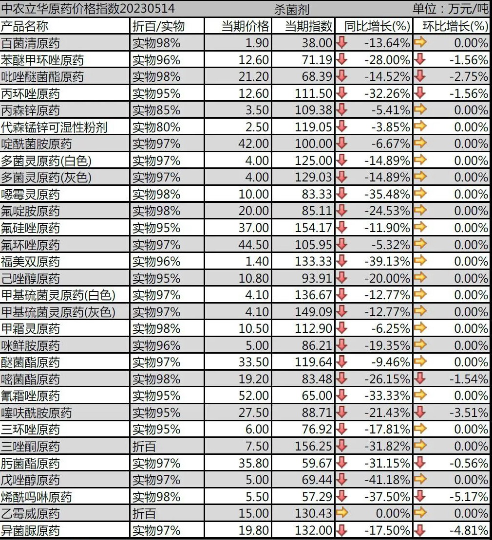 多菌靈原藥市場穩定為主,報價在4萬元/噸;甲基硫菌靈原藥市場貨源緊張,廠家排單為主,價格報到4.1萬元/噸;福美雙原藥價格1.4萬元/噸;甲霜靈原藥價格報到10.5萬元/噸;噁霉靈原藥市場價格報至10萬元/噸;氟啶胺原藥目前價格報20萬元/噸;咪鮮胺原藥廠家開工率提升,終端客戶消化庫存為主,市場報到5萬元/噸。