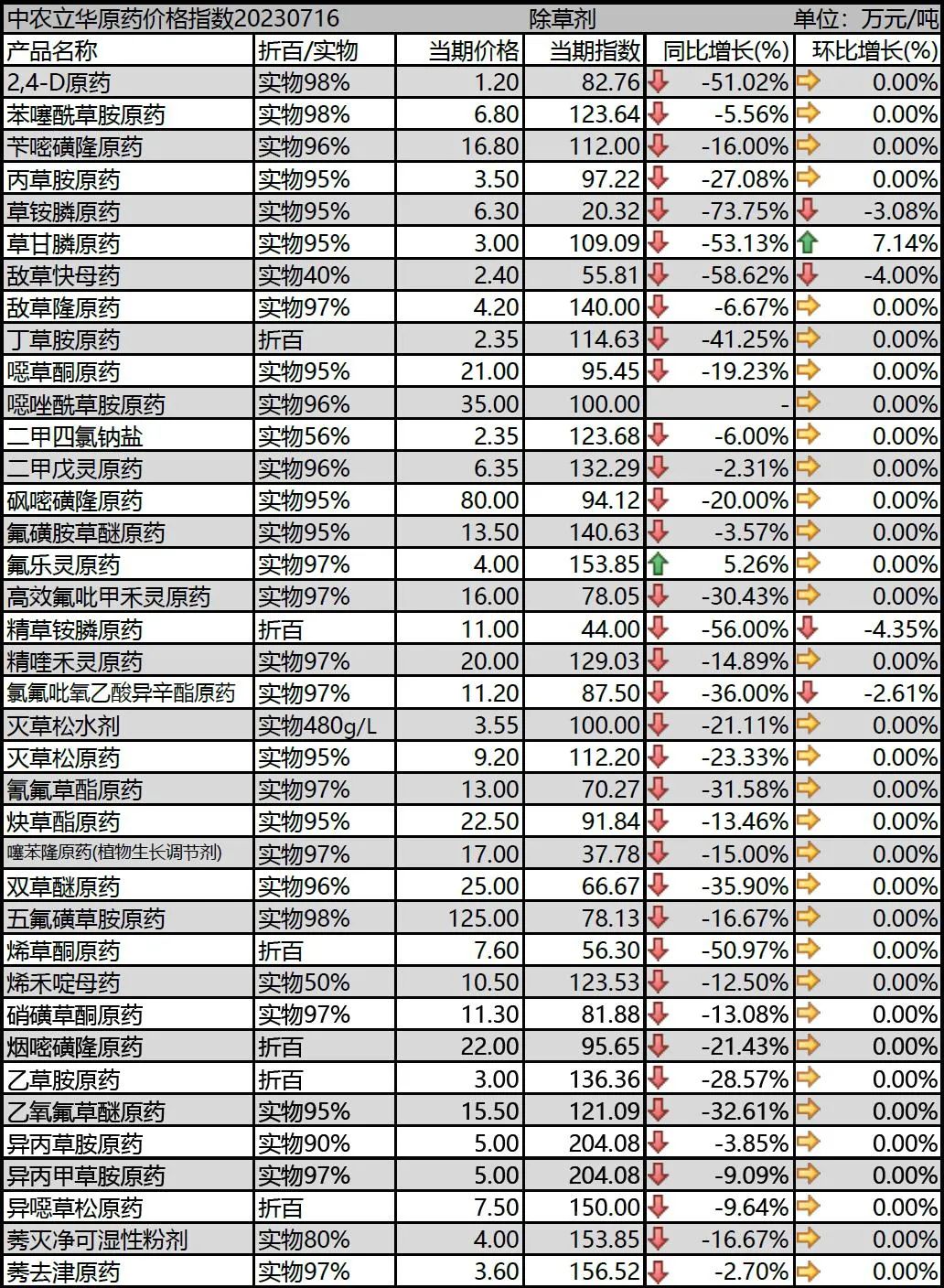 烯草酮原藥出口需求減量,內貿零星補貨,報到7.6萬元/噸;氯氟吡氧乙酸異辛酯原藥出口為主,國內淡季,市場去庫存中,市場報到11.2萬元/噸。