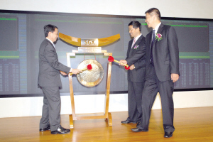 圖為心連心公司董事長劉興旭(右一)、新加坡交易所首席執行長謝福華(左一)和河南新鄉市市委常委、政法委書記李公樂一同為公司上市鳴鑼。