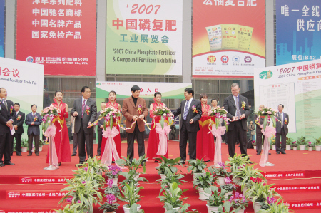 中華全國供銷合作總社理事會副主任顧國新、四川省副省長郭永祥、中國石化工業協會會長李勇武等為第八屆磷復肥產銷會剪彩。