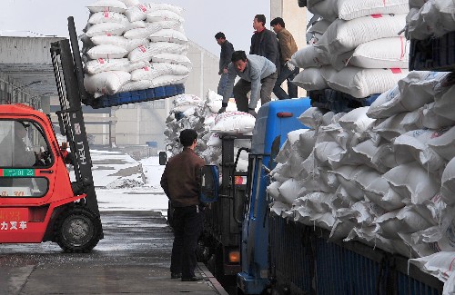 2月17日,中國石油寧夏石化公司員工往汽車上裝化肥。今年寧夏全區普遍降雪,土壤墑情較好,為保證農民春耕用肥,寧夏回族自治區供銷社與化肥生產廠家簽了近20萬噸主要化肥的購銷合同,并充分發揮全區供銷社系統農資供應主渠道作用,積極調運儲備化肥備戰春耕。新華社記者 劉泉龍 攝