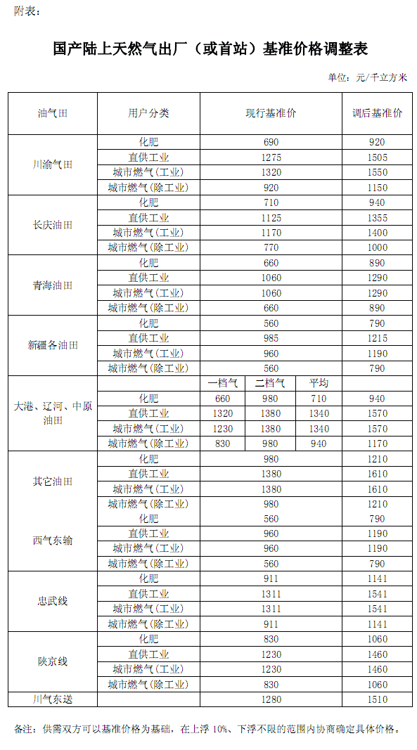 附:國產陸上天然氣出廠(或首站)基準價格調整表