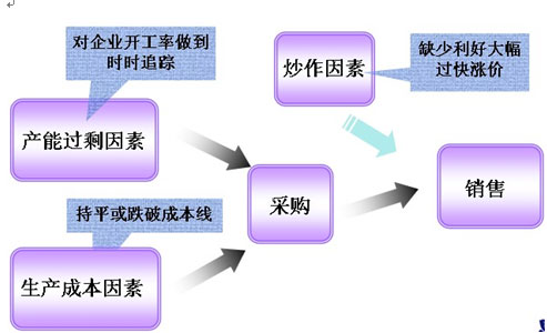 那么,針對廠家的銷售策略,流通企業也應以新的購銷思路操作。先說采購,把握時機很重要,要放棄以往買漲不買跌的想法。以行業開工率及企業生產成本兩點作為依據,判斷何時進貨。之后,以企業是否炒作作為銷售信號。具體流程如下圖所示。